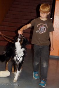 Die Kinder führten die Hunde mit viel Begeisterung an der Leine „bei Fuß“ durch das Schulgebäude, sowie durch einen aufgestellten Slalom-Parcours und belohnten das brave Verhalten der Vereinshunde mit Leckerchen.